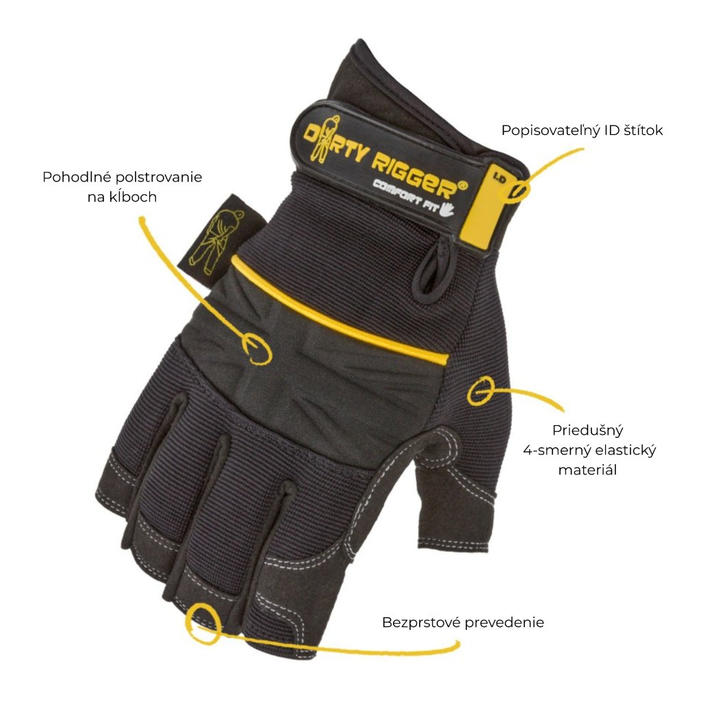 Bezprstové prevedenie rukavíc Comfort Fit ponúka okrem pohodlného a odolného riešenia pre ochranu vašich dlaní zároveň aj väčšiu voľnosť a citlivosť pri práci. Rukavice priľnú dobre na ruku a tým zamedzia zošuchnutiu. V najviac namáhaných častiach je použité spevnenie dvojvrstvovou syntetickou kožou. Kĺby chráni neoprénové polstrovanie.